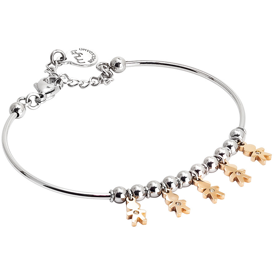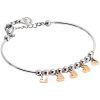 Bracciale rigido da donna in acciaio rodiato con charms Bimbo placcati oro rosa con zircone. Diametro bracciale 5,7 cm allungabile di 3,5 cm. Dimensione stelline 0,6 cm.