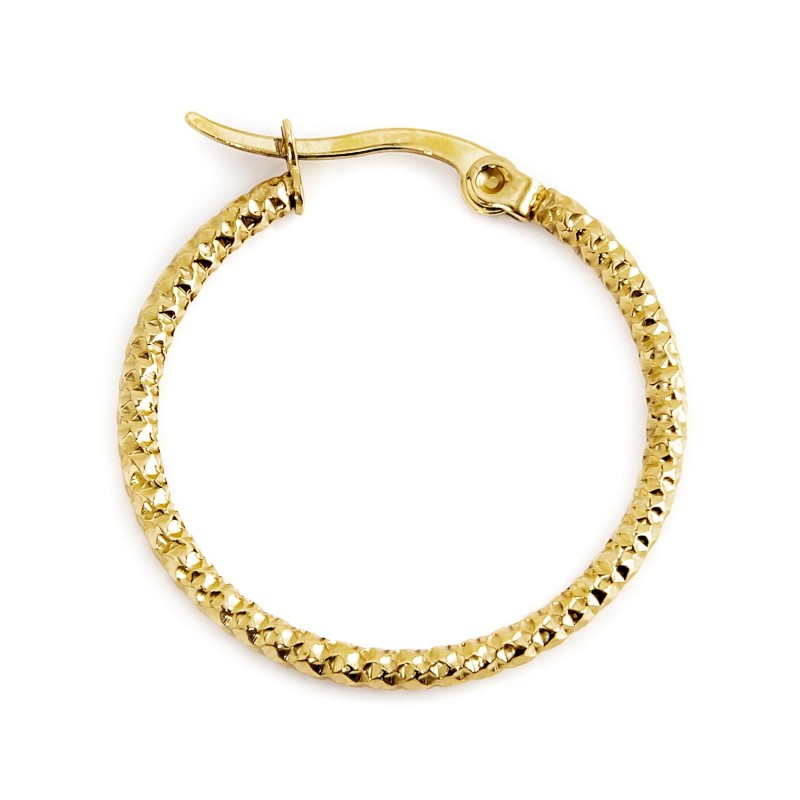 Mono Orecchino cerchio in acciaio martellato e pvd oro di diametro 2,6 cm e spessore 0,19 cm. Logo Marlù laserato sulla parte posteriore della chiusura.
